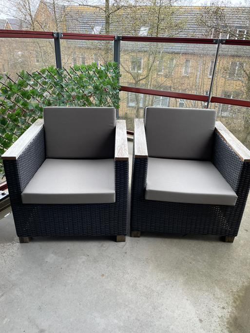 De twee stoelen op het balkon voorzien van nieuwe kussens